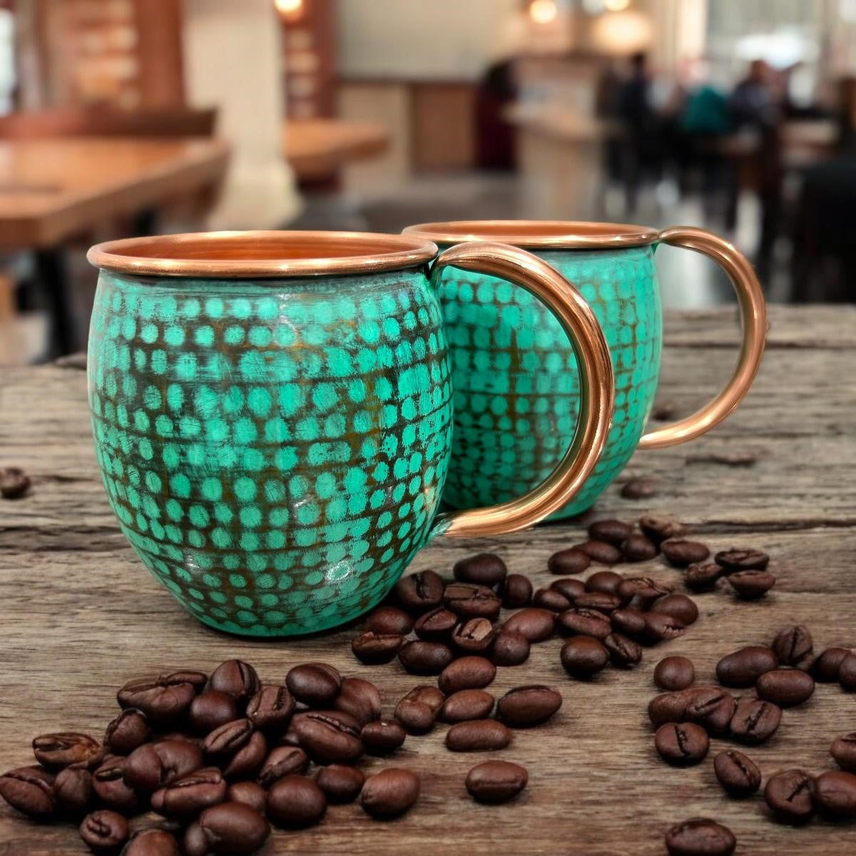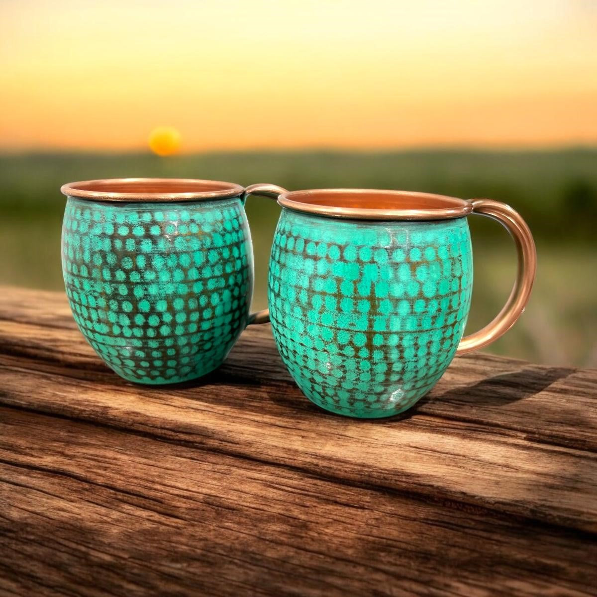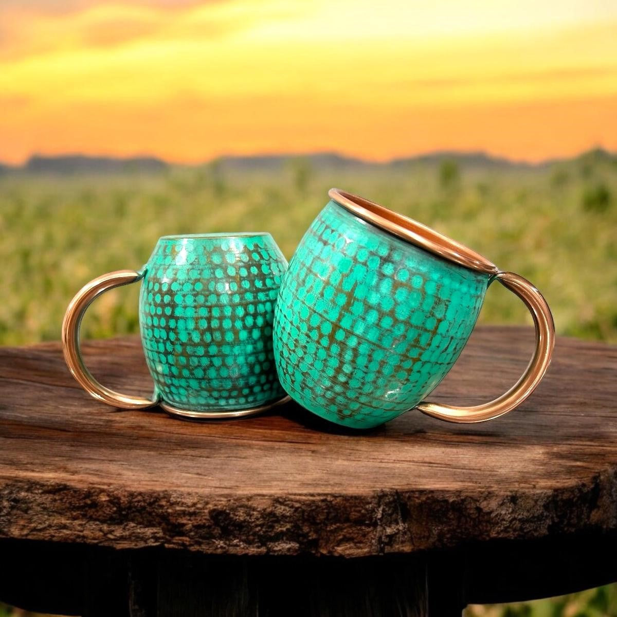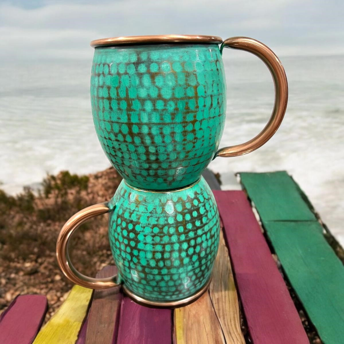Hammered and Mint Patina Handmade Copper Set of 2 Barrel Mugs (3.95